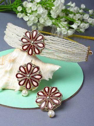 Karatcart Gold Plated Maroon Meena Floral Pearl Beaded Kundan Choker Necklace Set for Women